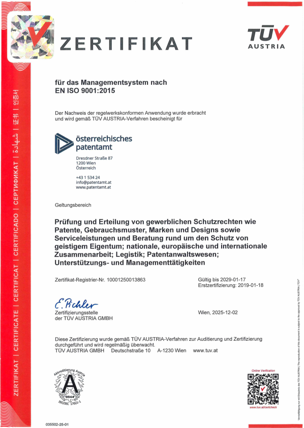 Die Prüfung und Erteilung von gewerblichen Schutzrechten wie Patente, Gebrauchsmuster, Marken und Designs sowie Serviceleistungen und Beratung rund um den Schutz von geistigem Eigentum sind durch DIN EN ISO 9001 : 2015 und ISO/IEC 27001 : 2022 zertifiziert.