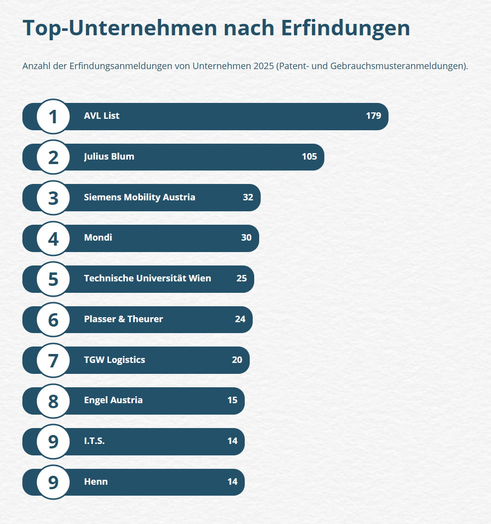 Bundeslaender_nach_Erfindungen_Jahresbericht_2025.png, png, 684 KBErfindungen_nach_Branchen_Jahresbericht_2025.png, png, 509 KBTop-Unternehmen_nach_Erfindungen_Jahresbericht_2025.png, png, 465 KBBundeslaender_nach_Marken_Jahresbericht_2025.png, png, 396 KBTop-Unternehmen_nach_Marken_Jahresbericht_2025.png, png, 346 KBStefan_Harasek_Credit-OEPA-Gassner_10_quer.jpg, jpg, 1 MB